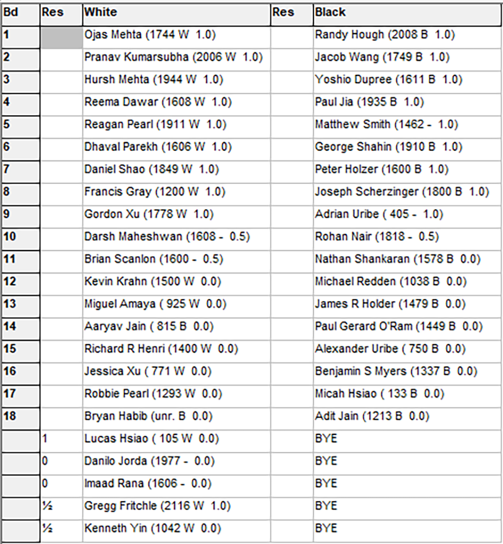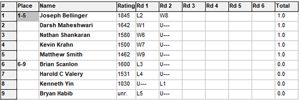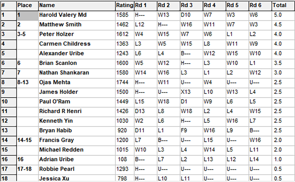 # | Place | Name | ID | Rtng | Rnd 1 | Rnd 2 | Rnd 3 | Rnd 4 | Rnd 5 | Total |
